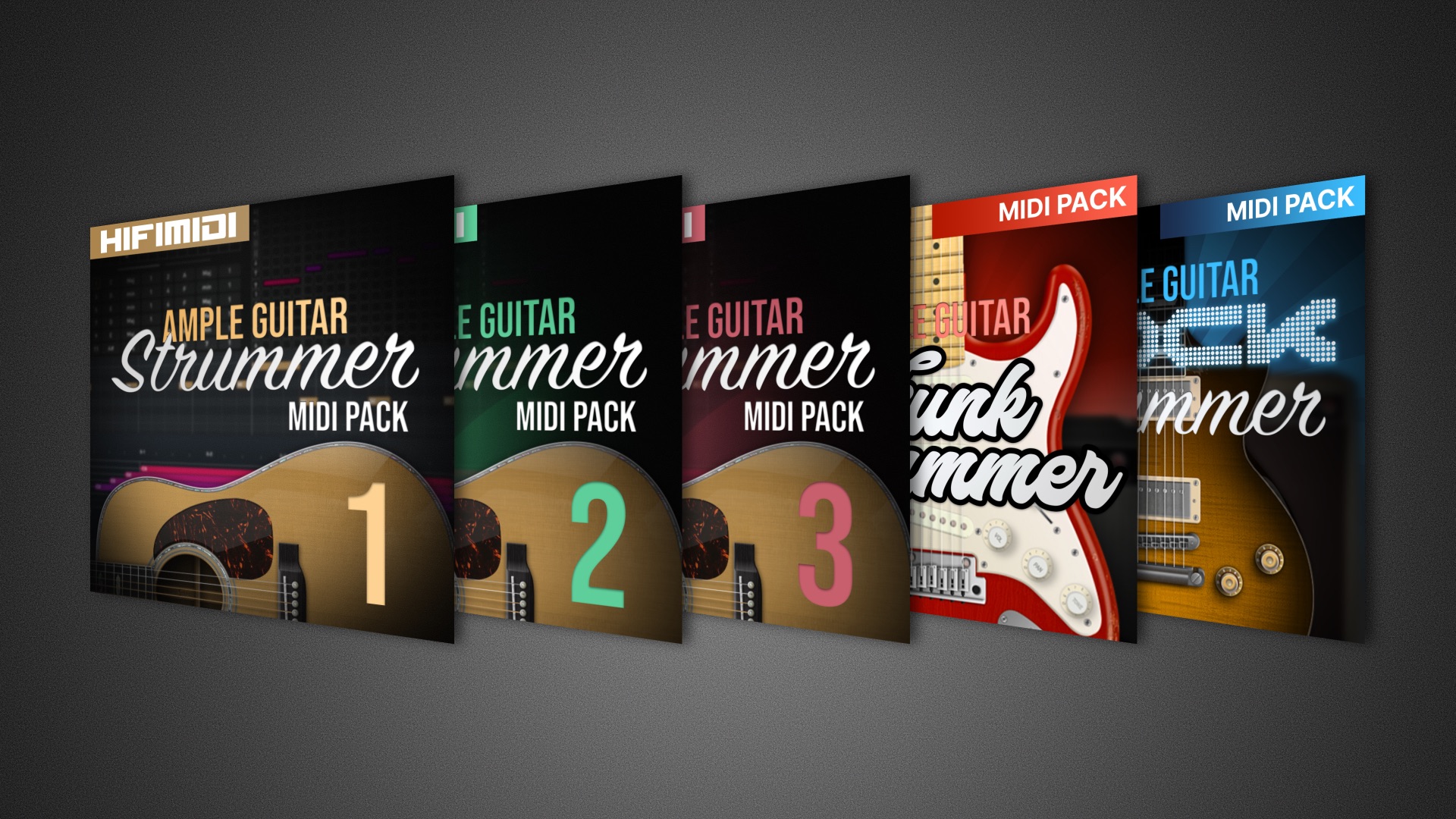 8 popular strumming patterns in 12 keys and 16 chords for Ample Sound acoustic guitars. Includes over 1, 500 MIDI files.
